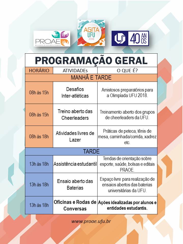 No AGITA UFU em Uberlândia, os estudantes poderão conhecer o principal Centro Esportivo Universitário da UFU (campus Educação Física), sua estrutura, os projetos de treinamento da Divisão de Esportes e Lazer Universitário (DIESU), as ações de saúde da Divisão de saúde do estudante (DISAU) bem como as demais ações realizadas pela PROAE: bolsas de assistência estudantil, alimentação e atendimentos psicopedagógicos. Nos campi fora de Uberlândia serão incentivadas e apoiadas ações das entidades estudantis.