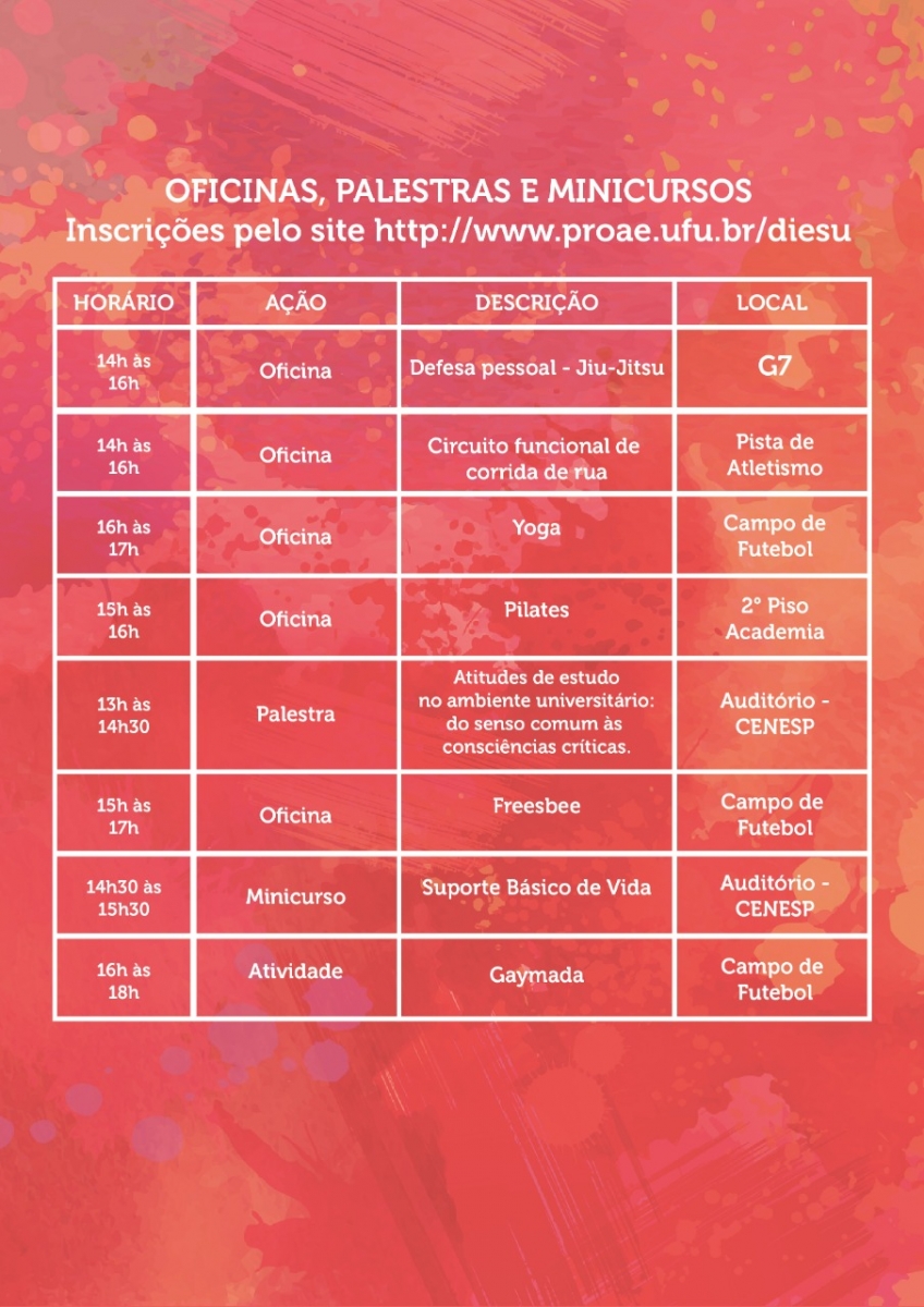 O AGITA UFU é um evento que promove ações voltadas para a melhoria da qualidade de vida dos participantes com atividades focadas na saúde metal, saúde alimentar, esporte, atividade física, palestras, oficinas e de orientações, além de ser um importante espaço para integração da comunidade acadêmica da UFU. Abaixo está a Programação completa do evento.