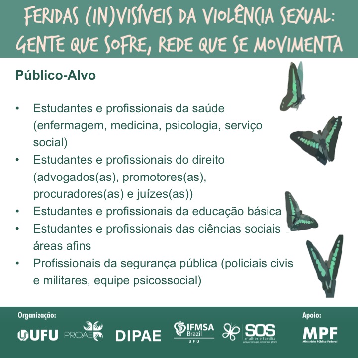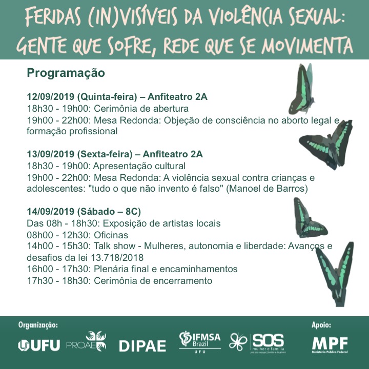 A Proae por meio da sua Divisão de Promoção de Igualdades e Apoio Educacional, a Dipae, em parceira com o Grupo Nuavidas e a ONG "SOS Mulher e familia" organizam entre os dias 12 e 14 de setembro de 2019 O "I Fórum Nacional NUAVIDAS HCU/UFU- “Feridas (in) visíveis da violência sexual: gente que sofre, rede que se movimenta". O Evento conta com apoio do Ministério Publico Federal e a "IFMSA Uberlândia" e tem o objetivo de integrar, qualificar e propor ações para a rede de atenção a pessoas em situação de violência sexual.