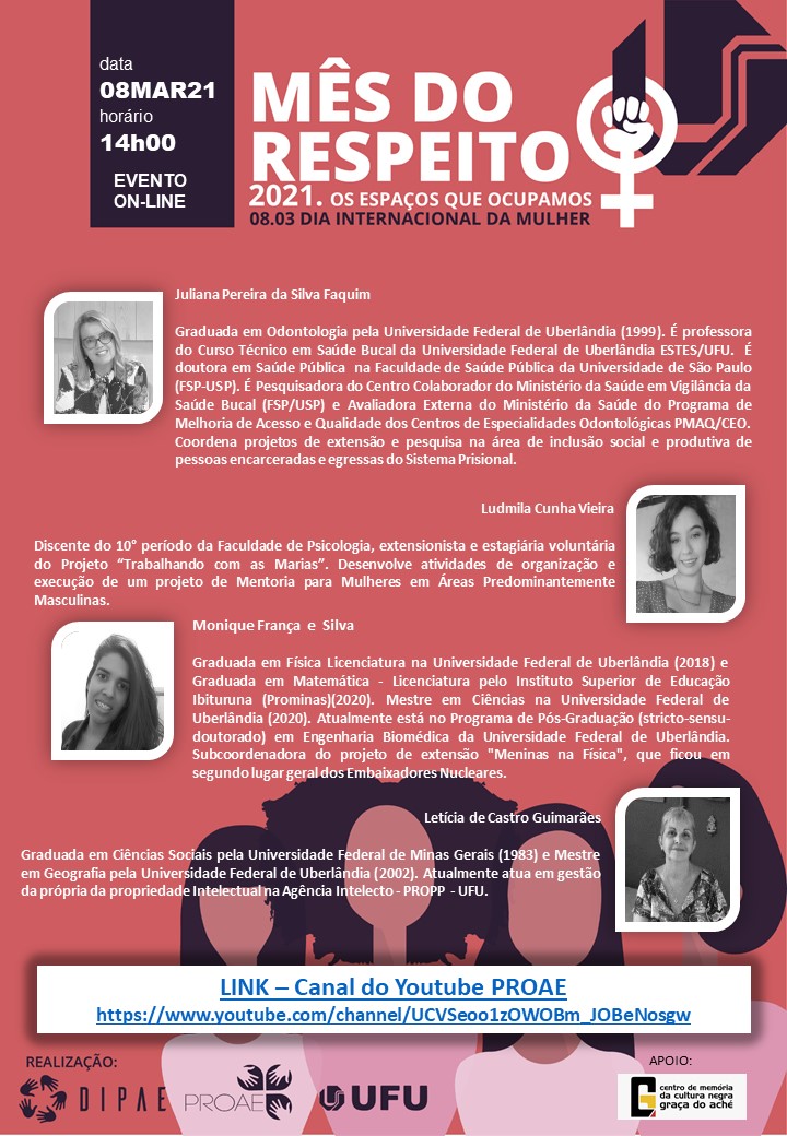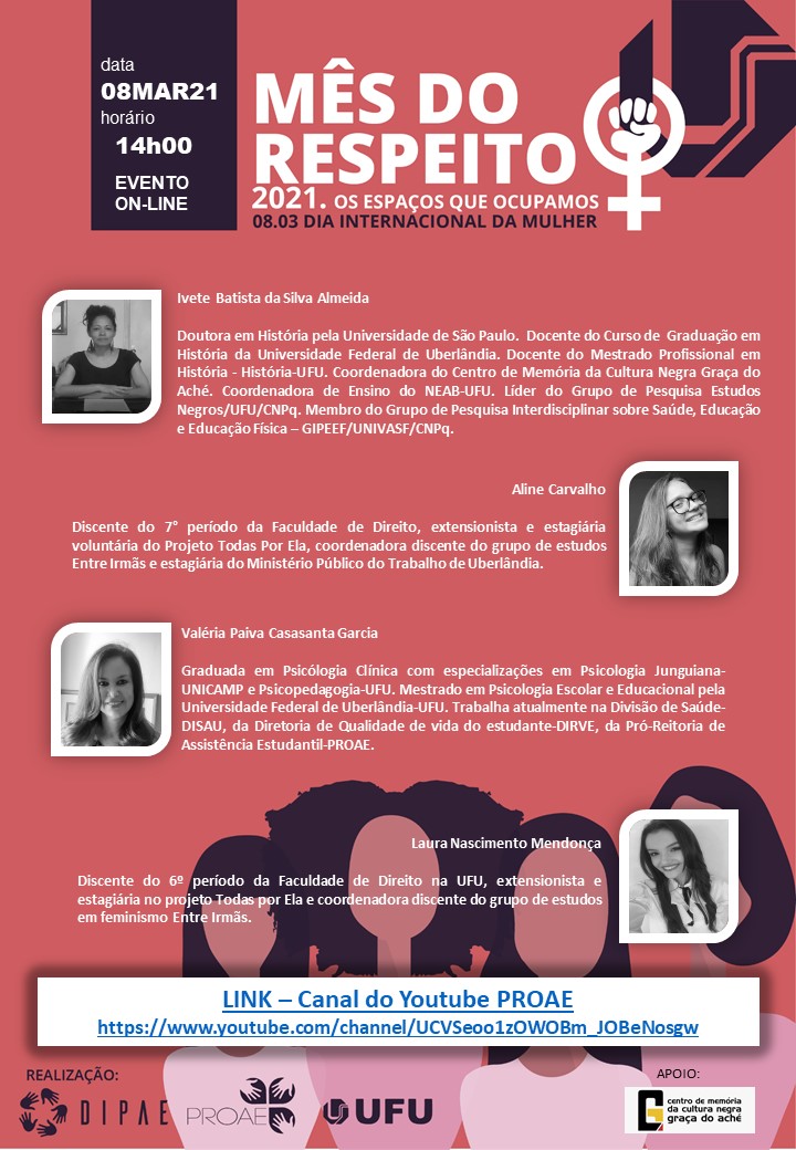 O evento abre as ações do “Mês do Respeito UFU”, e traz mulheres de diferentes áreas de atuação para discutir a representatividade e o espaço da mulher, tanto no cenário da UFU, quanto no mundo atual.