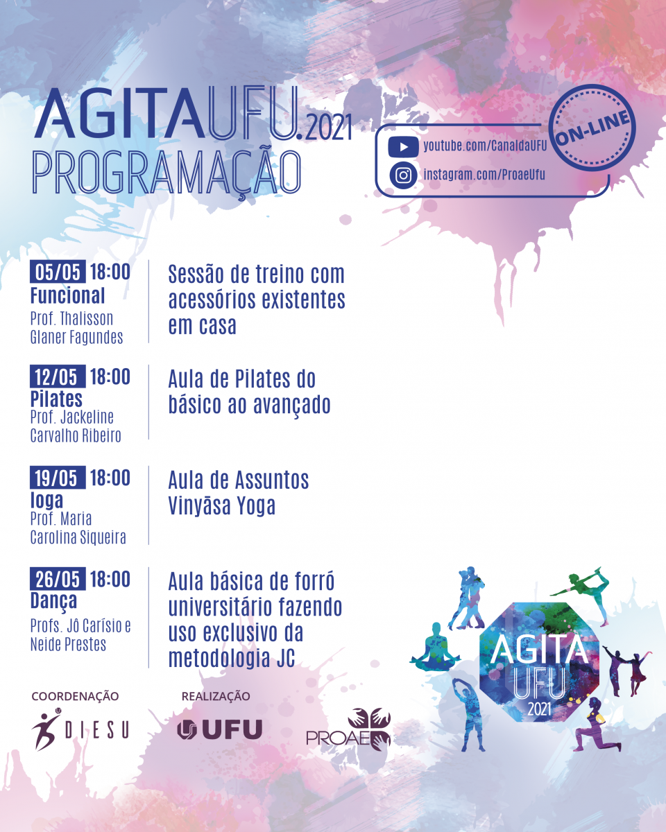 O evento acontecerá ao vivo por meio dos canais oficiais da UFU e PROAE nas plataformas YouTube e Instagram. O objetivo é promover ações voltadas para a qualidade de vida e a saúde mental e física da comunidade acadêmica, por meio de videoaulas (treinos online), abordando atividades práticas de cuidados com a saúde mental, atividades físicas e de lazer, sendo um importante espaço para interação e promoção da saúde para os discentes da UFU. Será disponibilizado, durante as aulas, um formulário para emissão de certificados de participação nas ações.