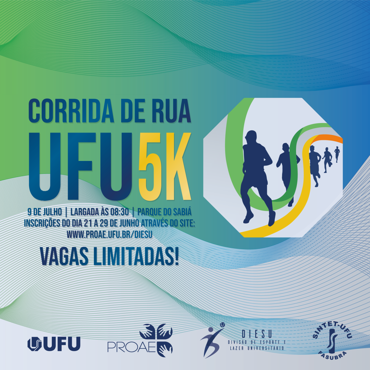 Divisão de Esporte e Lazer Universitário da UFU (Diesu) abre, a partir de amanhã (21/06), as inscrições para a Corrida de Rua UFU 5K. O evento acontecerá no sábado (09/07) no Parque do Sabiá. A participação é gratuita e aberta à toda comunidade UFU.