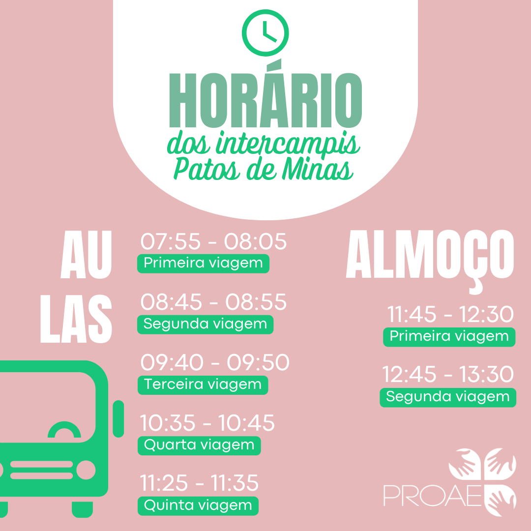 5 horários de linhas de ônibus nos intervalos das aulas entre a Unidade UNIPAM e a Unidade Laboratório Pesquisa e Ensino.