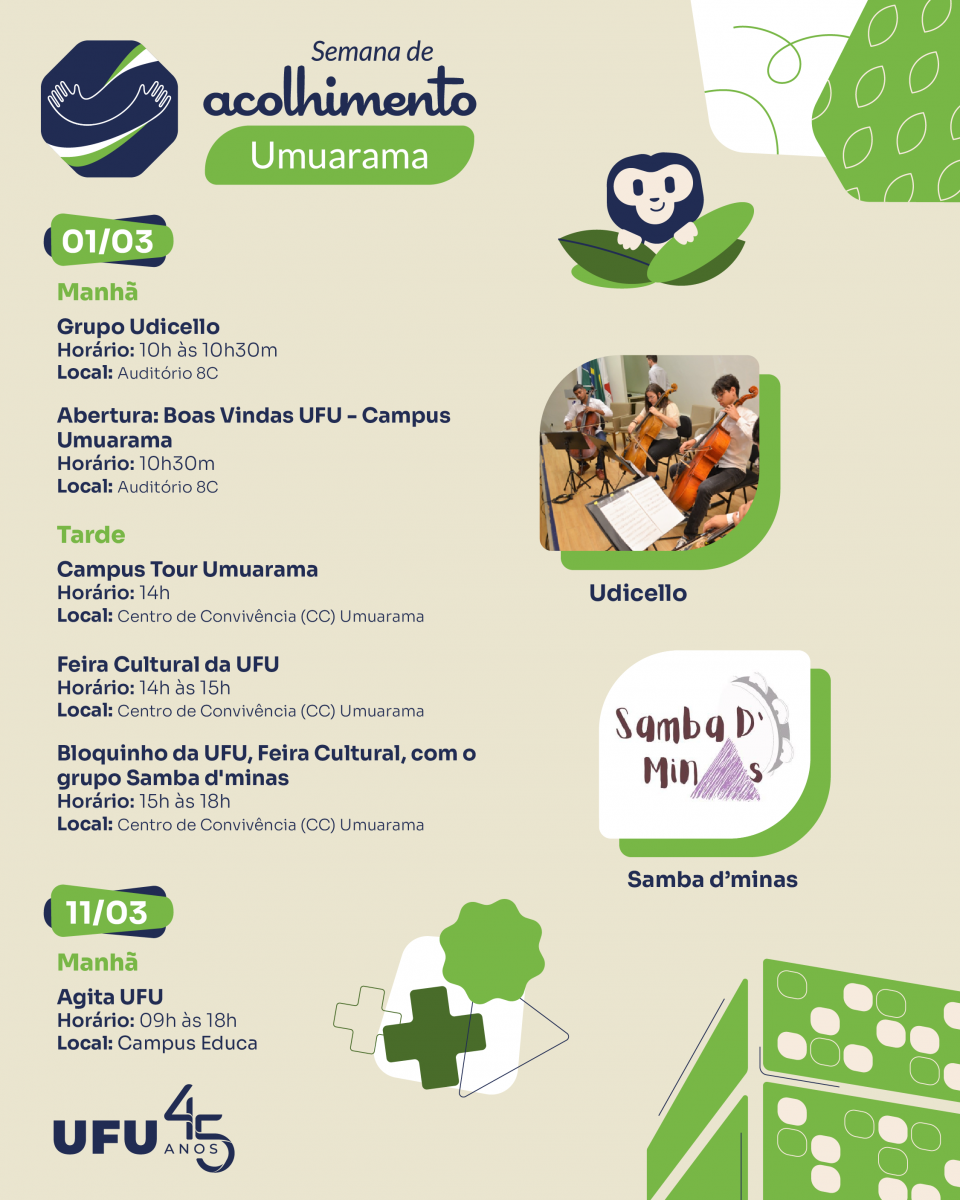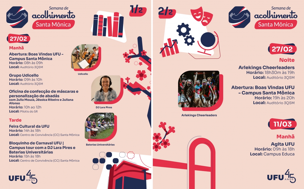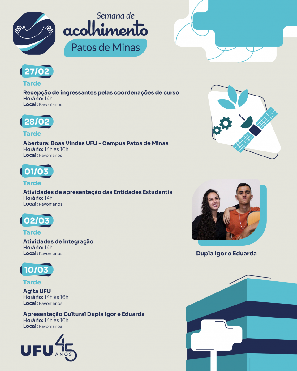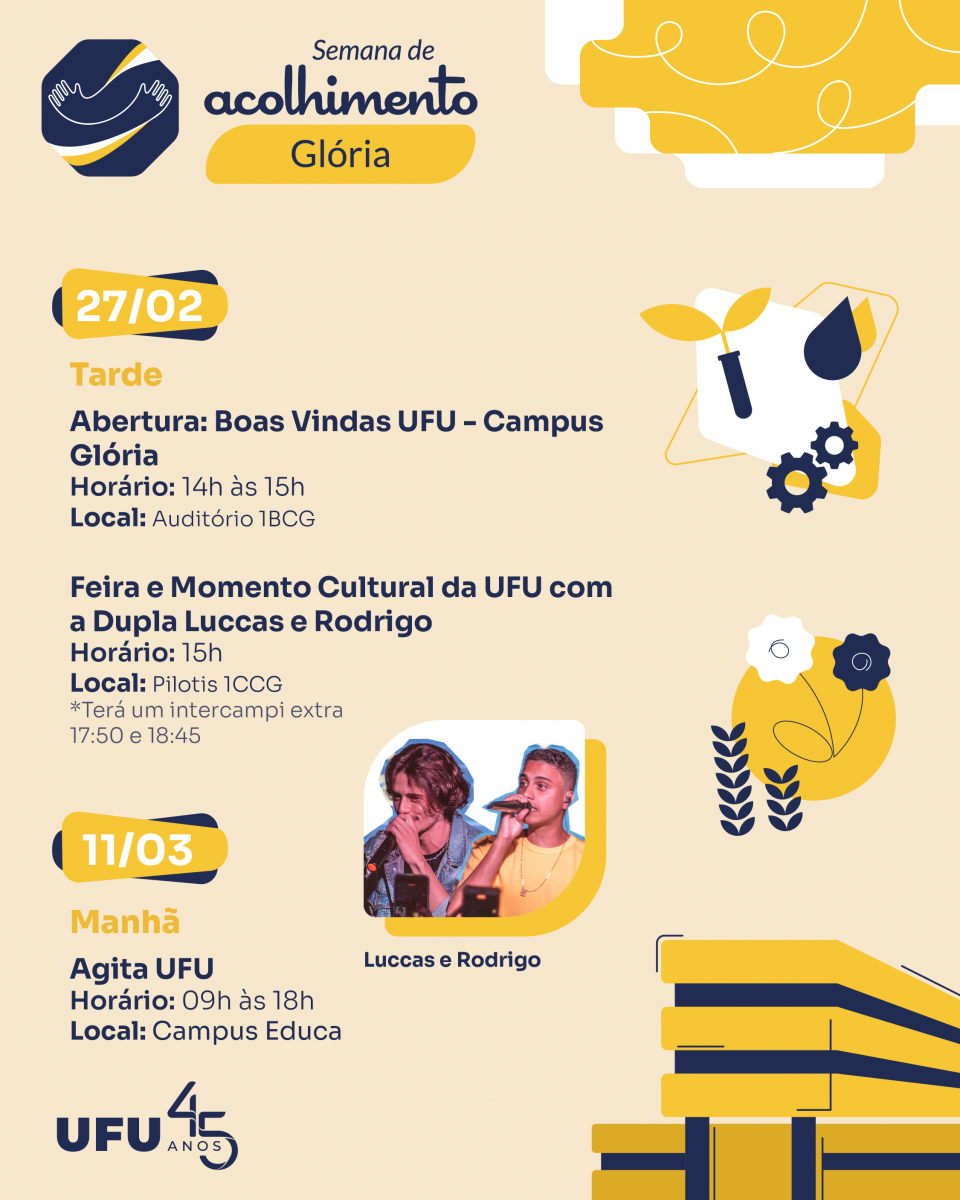 Em todos os sete campi da UFU – Santa Mônica, Umuarama, Glória, Educação Física, Pontal, Monte Carmelo e Patos de Minas – serão desenvolvidas atividades voltadas à apresentação da universidade aos calouros, promovendo a integração social e a orientação educativa.