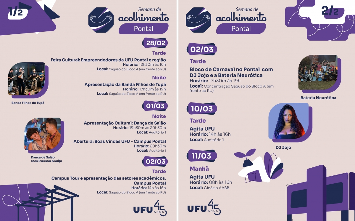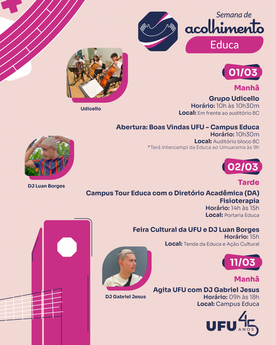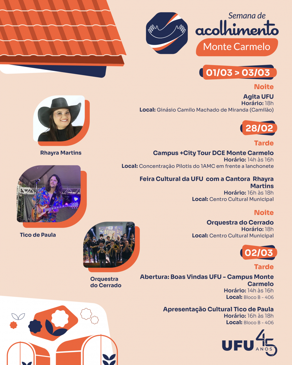 Vale lembrar que a Semana de Acolhimento se trata de um projeto macro em três etapas: a primeira consiste na apresentação geral da universidade, com as boas-vindas aos ingressantes; a segunda parte da ação de interação e integração proporcionada pelos Bloquinhos e pela cena cultural nos campi; e, por fim, a terceira marca o encerramento com o Agita UFU.