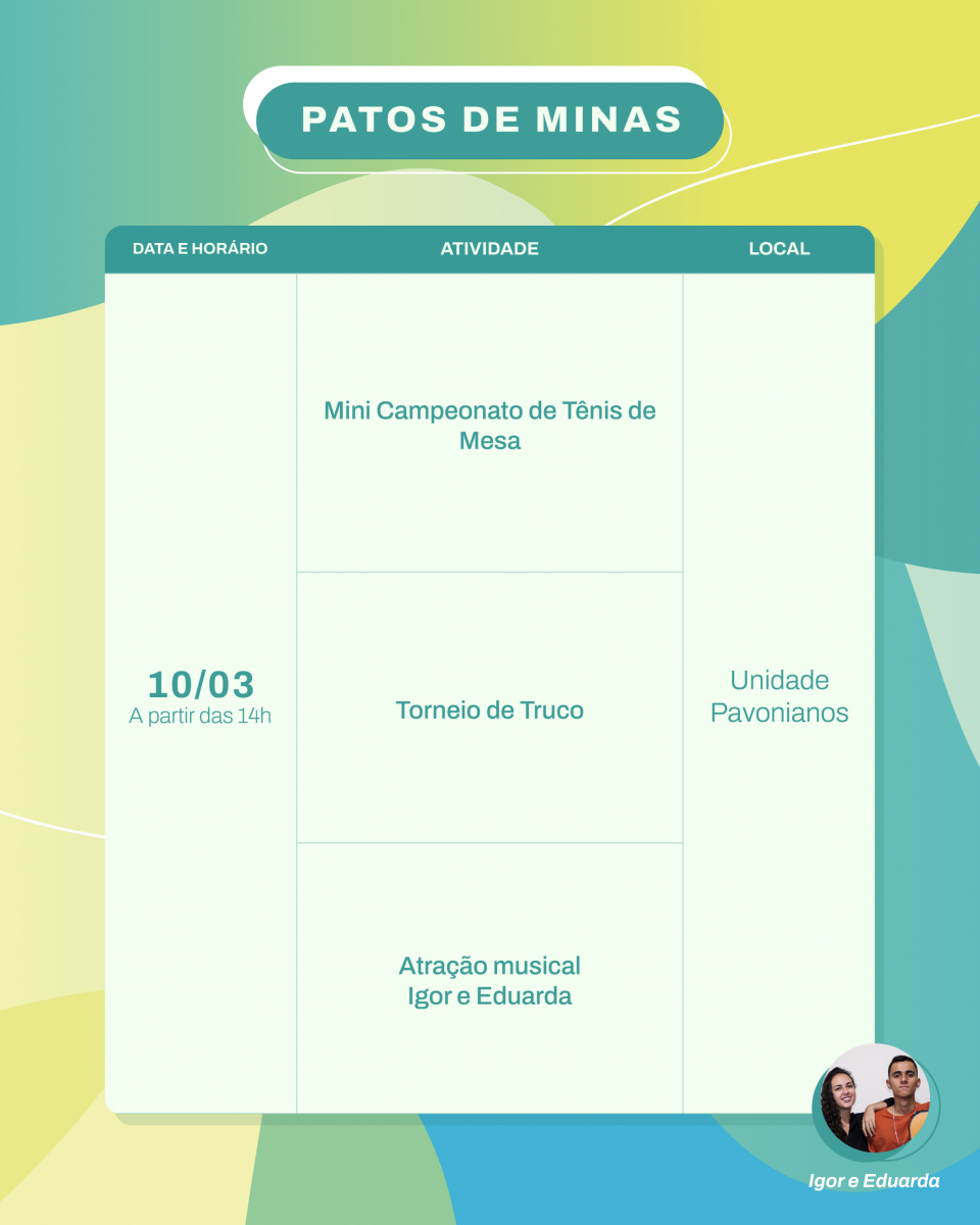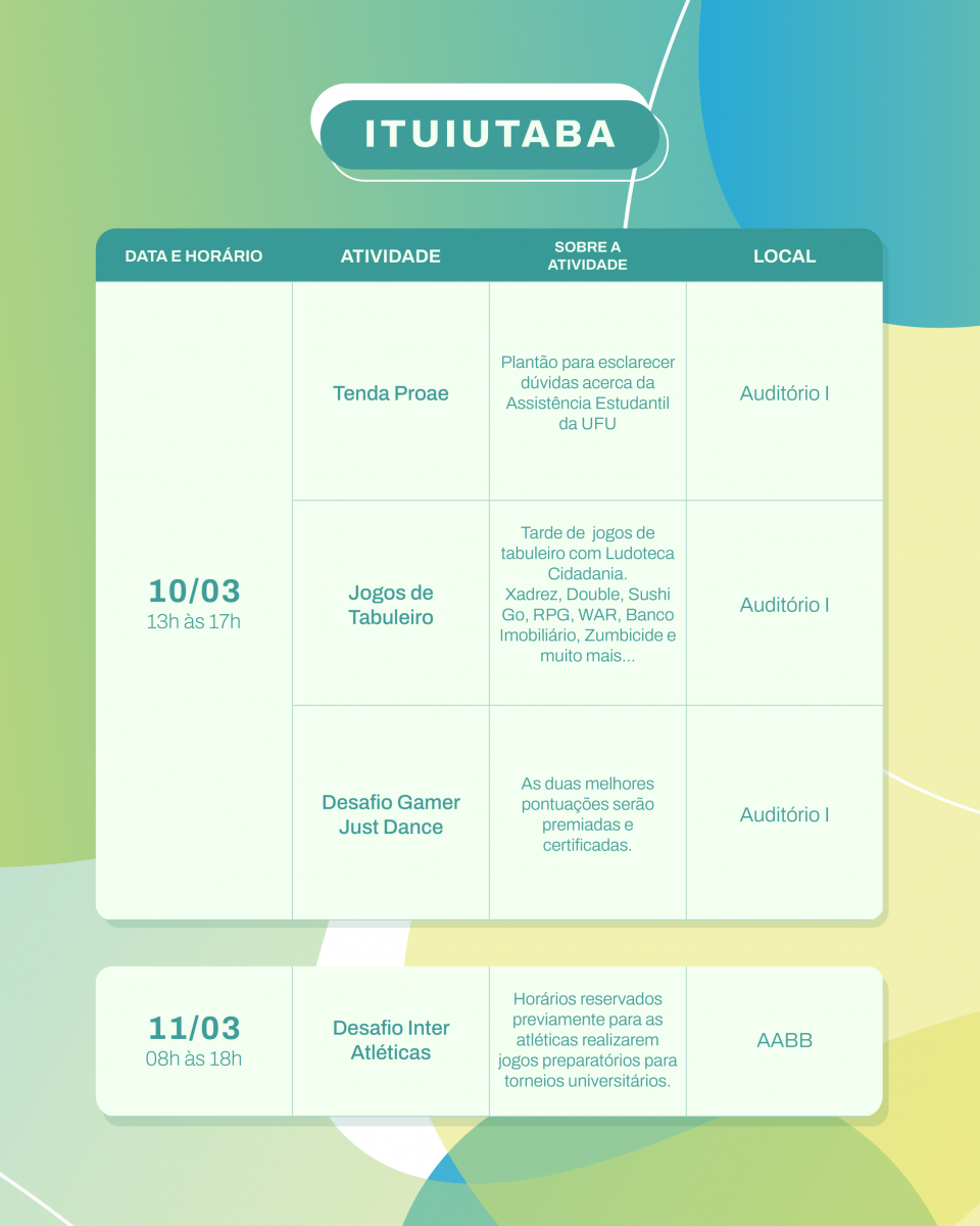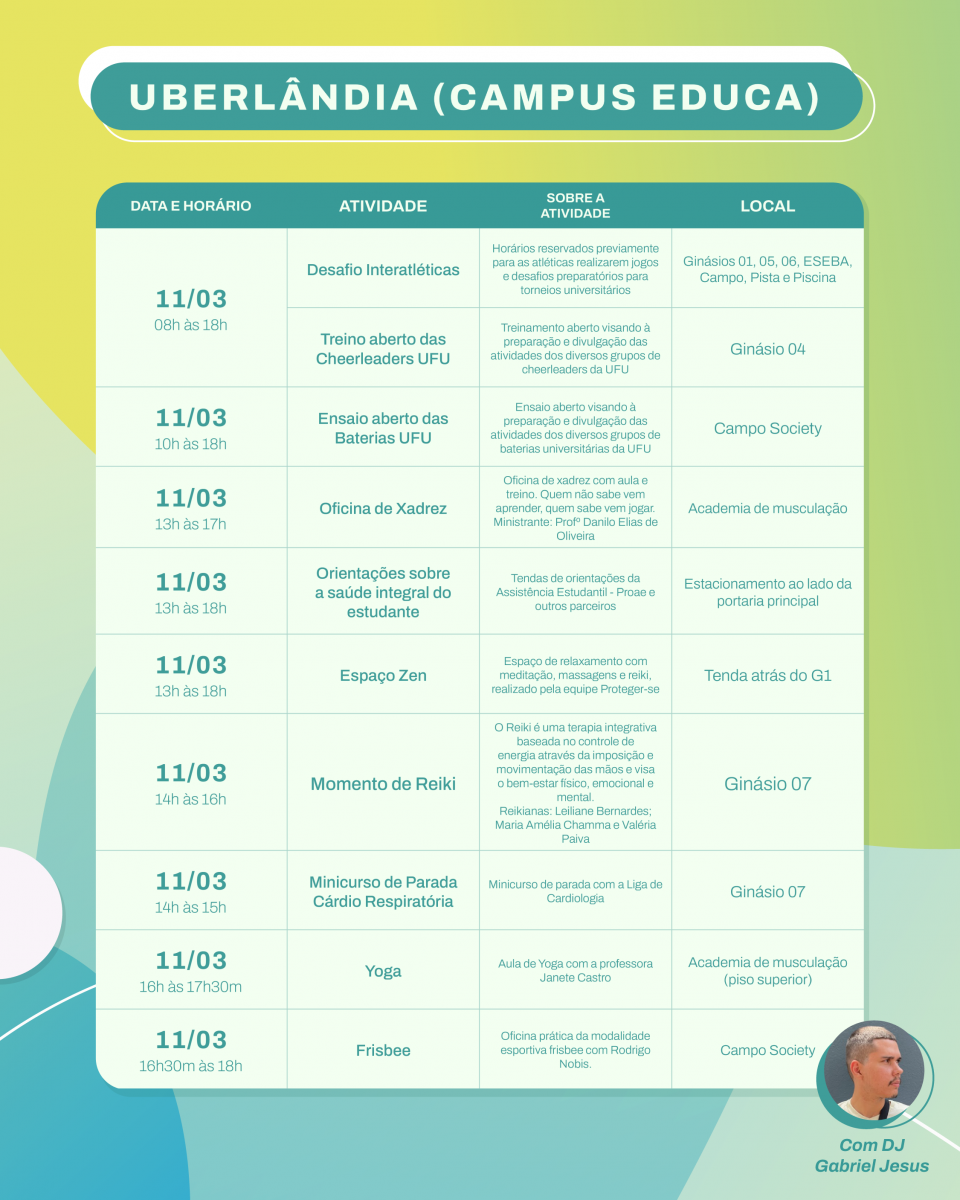 A iniciativa acontece nos campi Educação Física, Pontal, Monte Carmelo e Patos de Minas e cada um conta com uma programação própria. As atividades incluem torneios, minicampeonatos, amistosos, desafios, oficinas, minicursos, rodas de conversa, orientações sobre saúde, práticas de meditação e yoga, apresentações culturais e muito mais! Acesse o formulário para se inscrever nas atividades de Uberlândia, Ituiutaba e Patos de Minas.