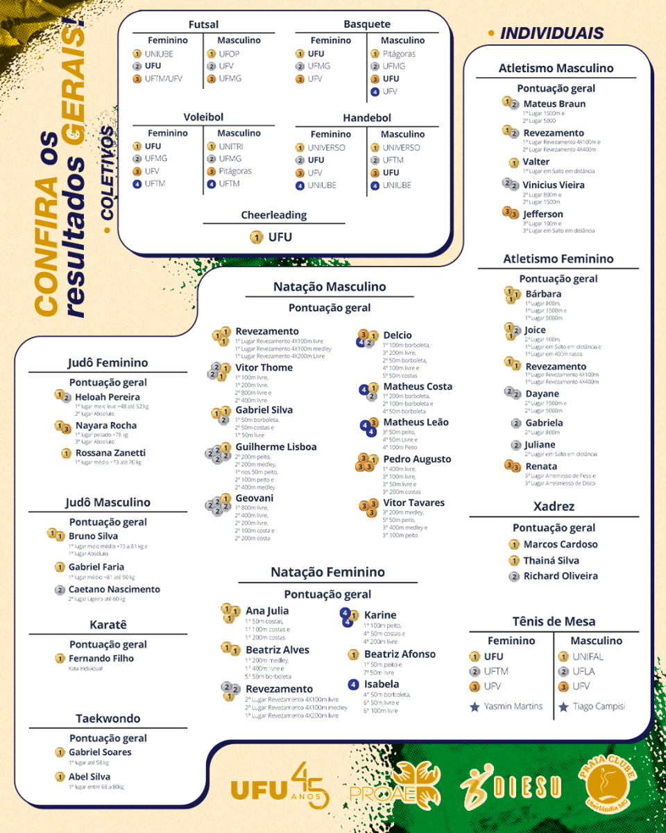 Entre os dias 5 e 9 de abril, aconteceu os Jogos Universitários Mineiros 2023, na cidade de Uberaba. O evento reuniu estudantes de todo o estado para competir em 12 modalidades esportivas (Atletismo, Natação, Karatê, Judô, Taekwondo, Xadrez, Tênis de mesa, Futsal, Basquete, Handebol, Vôlei e Cheerleading) e a Universidade Federal de Uberlândia (UFU) mais uma vez foi destaque por sua atuação.