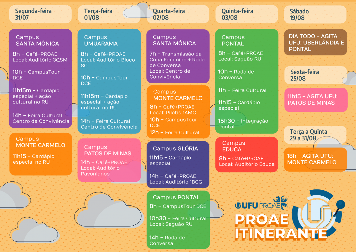 Na primeira semana do semestre 2023/1, a Pró-Reitoria de Assistência Estudantil da Universidade Federal de Uberlândia realizará o evento Proae Itinerante, uma iniciativa diversa e esclarecedora que visa fornecer informações fundamentais sobre a assistência estudantil no âmbito da universidade.