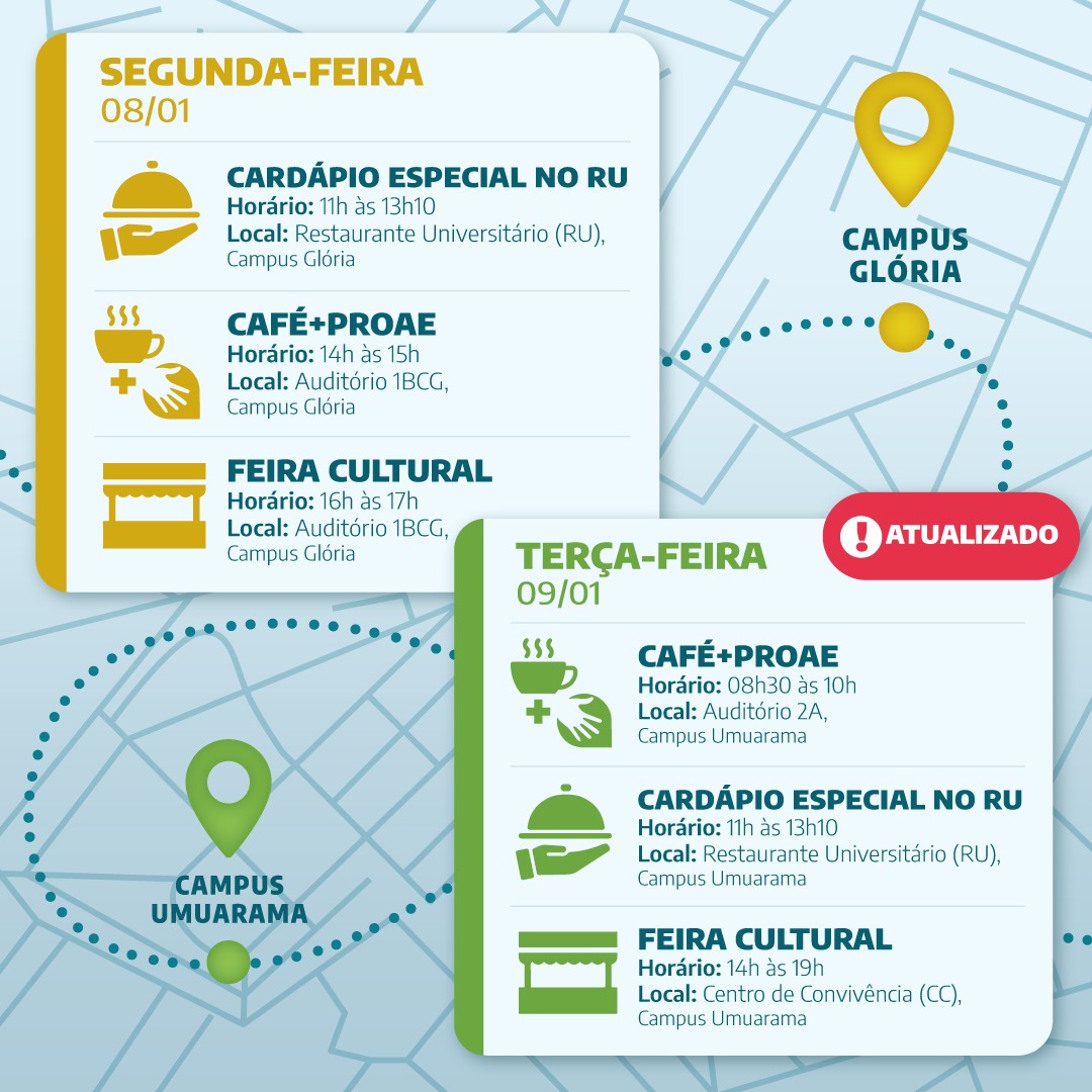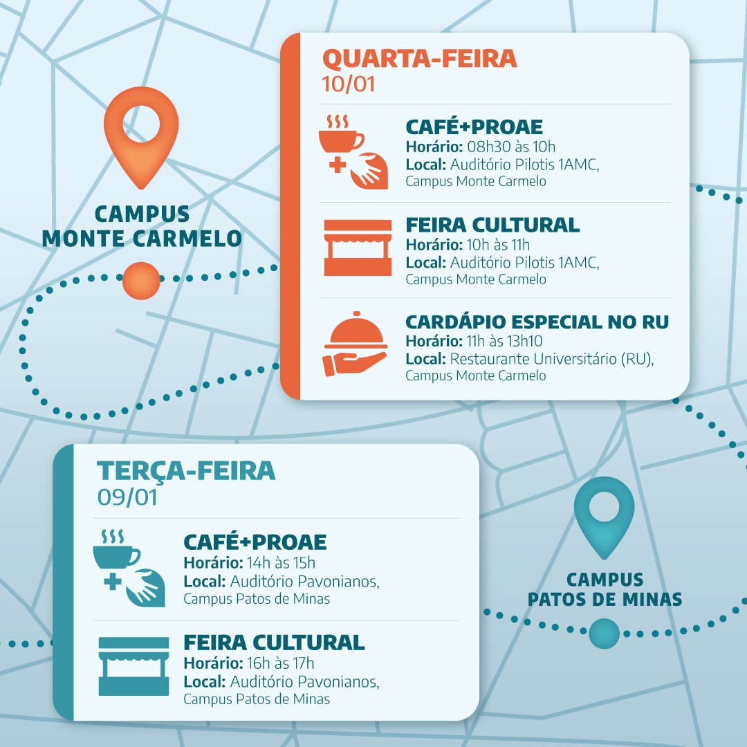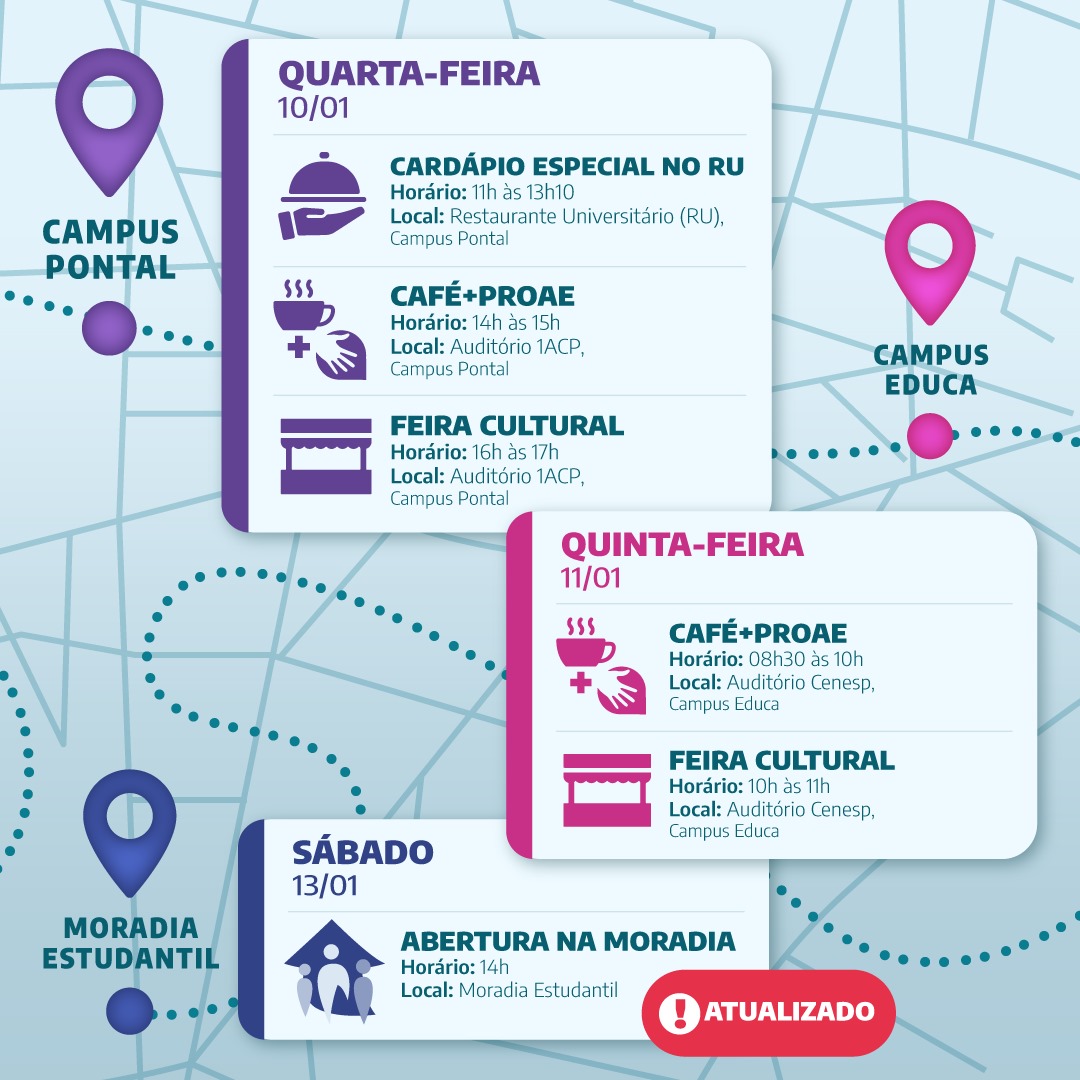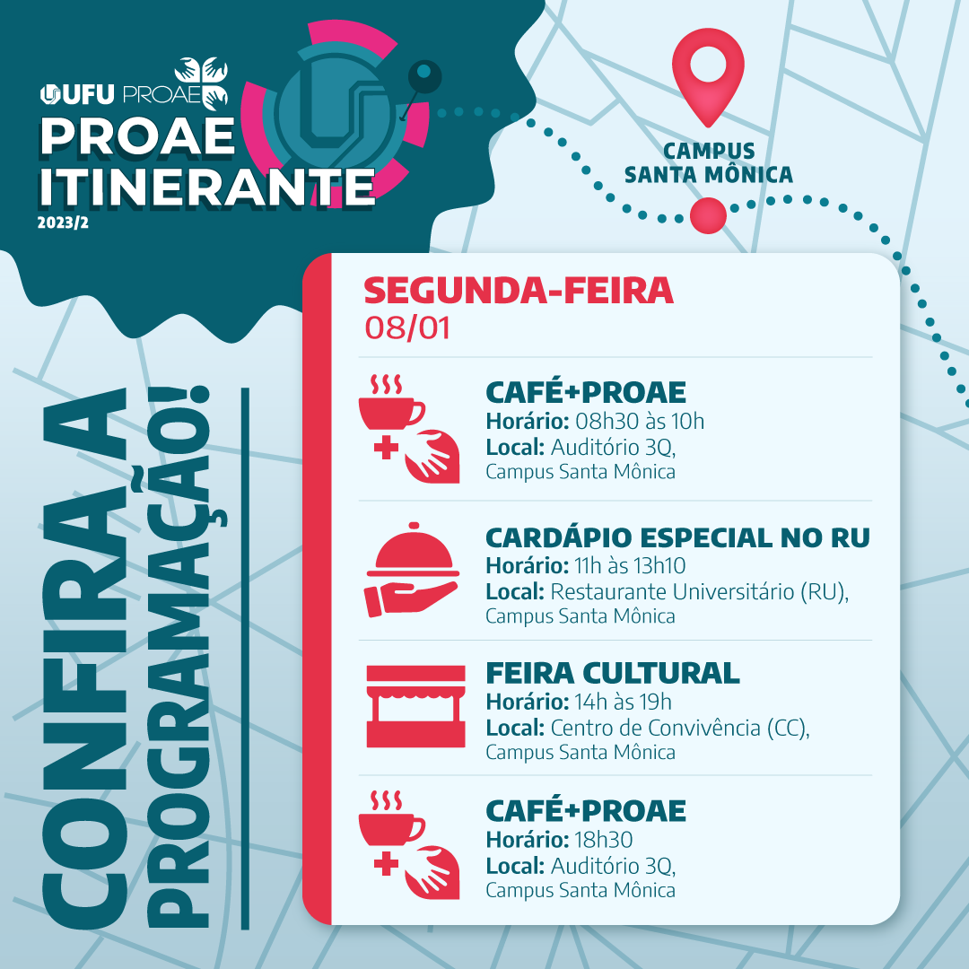 Mais do que um evento informativo, o Proae Itinerante é uma chance de integração! Conecte-se com outros estudantes, estabeleça laços e mergulhe na rica comunidade acadêmica da UFU. A equipe da Assistência Estudantil e os coordenadores do evento estão comprometidos em oferecer uma semana repleta de conhecimento e orientações valiosas para que você aproveite ao máximo a sua experiência universitária.
